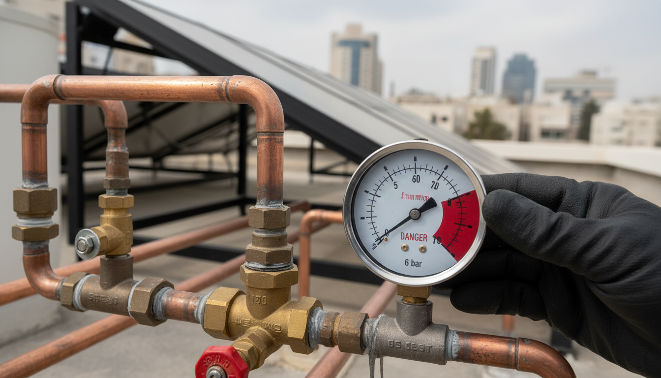 בערים מסוימות בישראל (במיוחד אזורים מוגבהים כמו ירושלים, צפת או מעלה אדומים), לחץ המים העירוני עלול להגיע ל-7-8 בר ויותר. אם לא מותקנים שסתומי הפחתת לחץ (PRV – Pressure Reducing Valve) בכניסה לבניין או למערכת, כל הלחץ הזה עובר ישירות לצנרת המים החמים ועלול לפוצץ אותה.